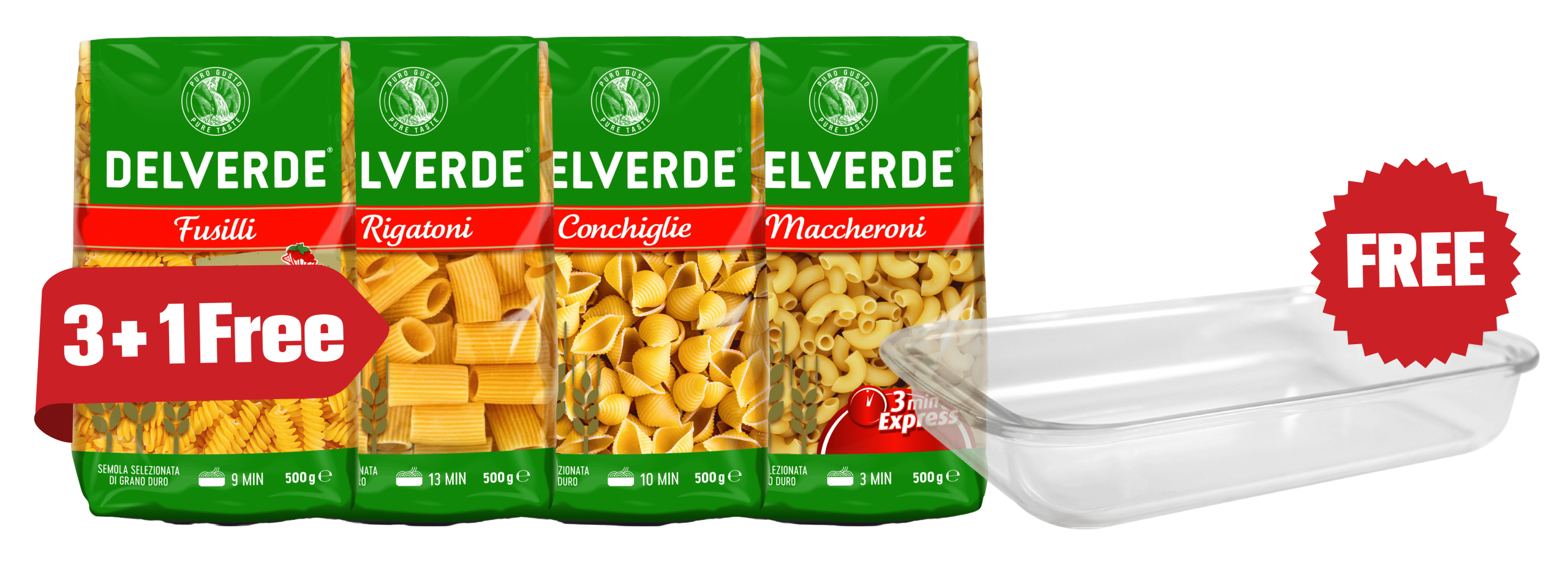 Delverde Fusilli Xsugo + Rigatoni+ Conchiglie Rigate + Maccheroni (3+1) +Pyrex gift